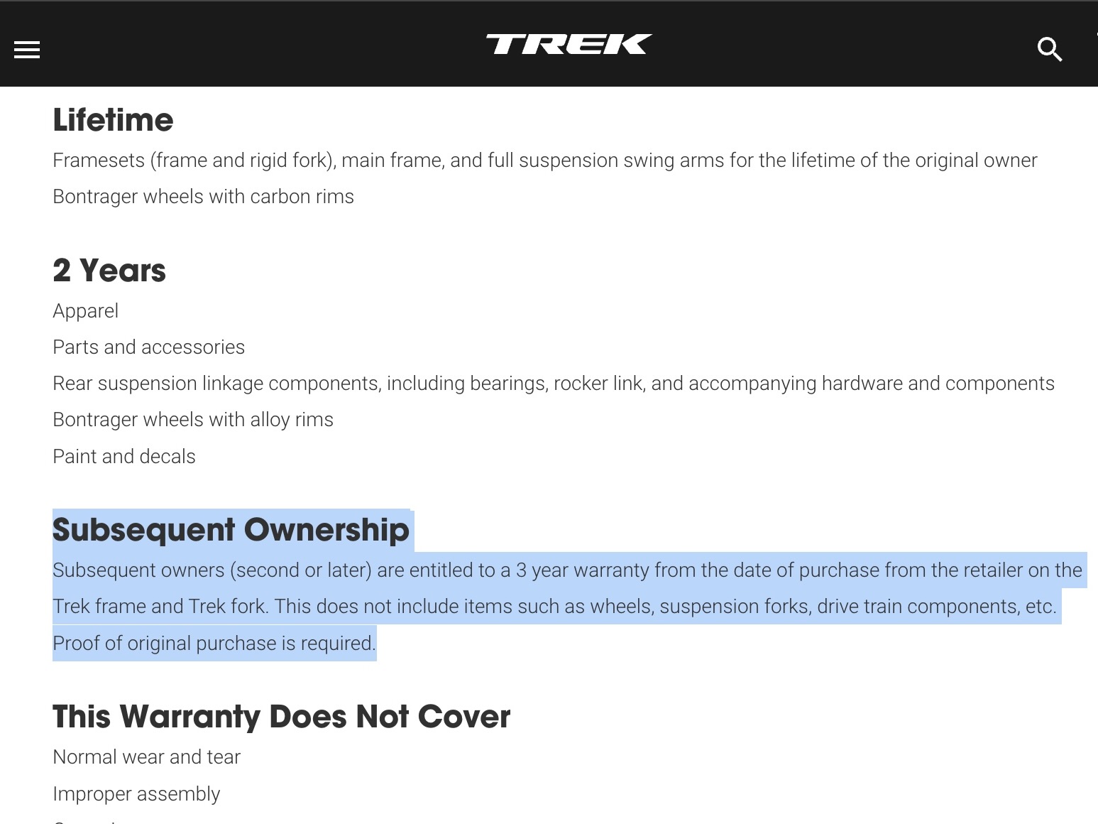 1. Trek Bicycles: 3-Year Transferable Frame Warranty